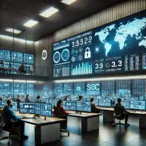 DALL·E 2024-09-02 15.27.13 – A modern Security Operations Center (SOC) with a large video wall displaying real-time cybersecurity analytics, threat intelligence, and network statu